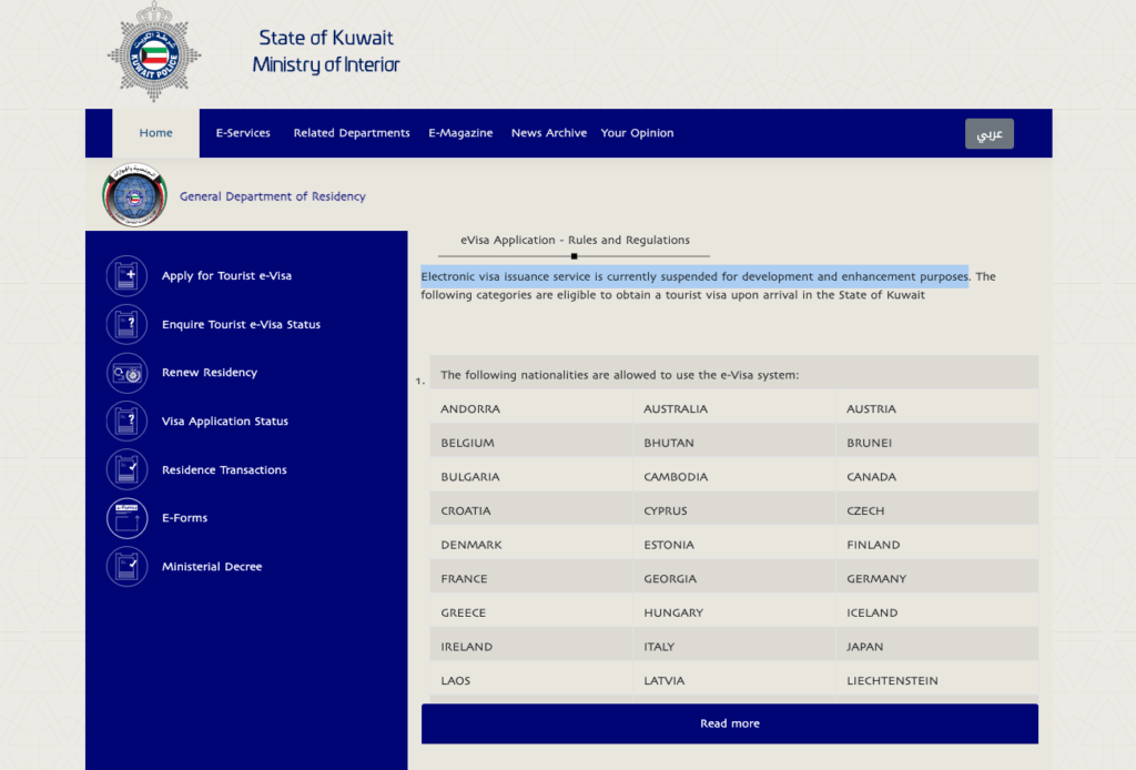 Le gouvernement koweïtien a décidé de couper le robinet de son service e-Visa, laissant dans le flou les futurs visiteurs. Motif invoqué ? Une mise à jour du système pour le rendre plus performant. Mais attention, pas de panique ! Si le portail evisa.moi.gov.kw affiche complet, les portes du pays ne sont pas pour autant hermétiquement closes.