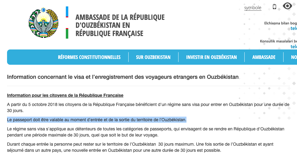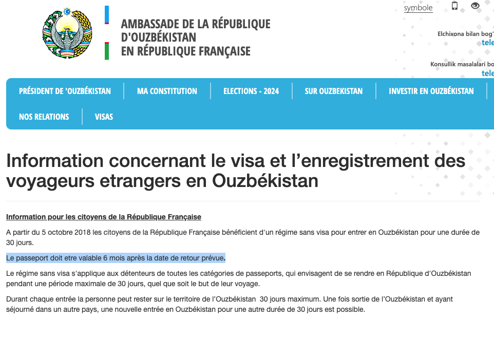 Until now, nationals of several countries, including France, Germany, the UK, the USA, etc., could enter Uzbekistan without a visa for stays of up to 30 days, provided their passport was valid at the time of entry.