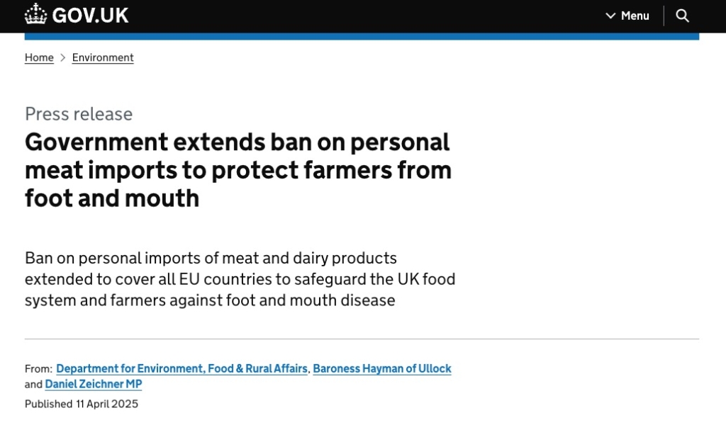 El Ministro de Agricultura británico, Daniel ZeichnerEl Gobierno del Reino Unido hará todo lo posible para proteger a los ganaderos británicos de la fiebre aftosa", declaró el Ministro de Agricultura, Desarrollo Rural y Pesca del Reino Unido. Dr. Jorge Martín-AlmagroEl Jefe Adjunto de los Servicios Veterinarios del Reino Unido para Asuntos Internacionales y Comerciales, señaló que la ampliación de las restricciones a las importaciones personales de productos alimentarios con riesgo de transmisión de la fiebre aftosa se produce tras la detección de la enfermedad en países de la UE, lo que conlleva un mayor riesgo de introducción en Gran Bretaña.