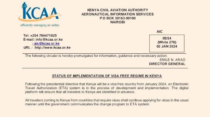 Nonostante l'annuncio del Presidente William Ruto a dicembre, laAutorità dell'aviazione civile del Kenya (KCAA) ha dichiarato ieri (2 gennaio) che la politica rimarrà incerta fino a quando non sarà finalizzato un nuovo sistema di autorizzazione elettronica al viaggio (ETA).