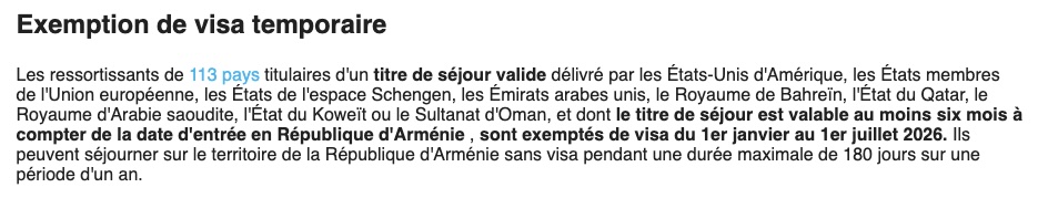 L’exemption de visa permet un séjour de 180 jours par an, l’Arménie permet donc un séjour longue durée.