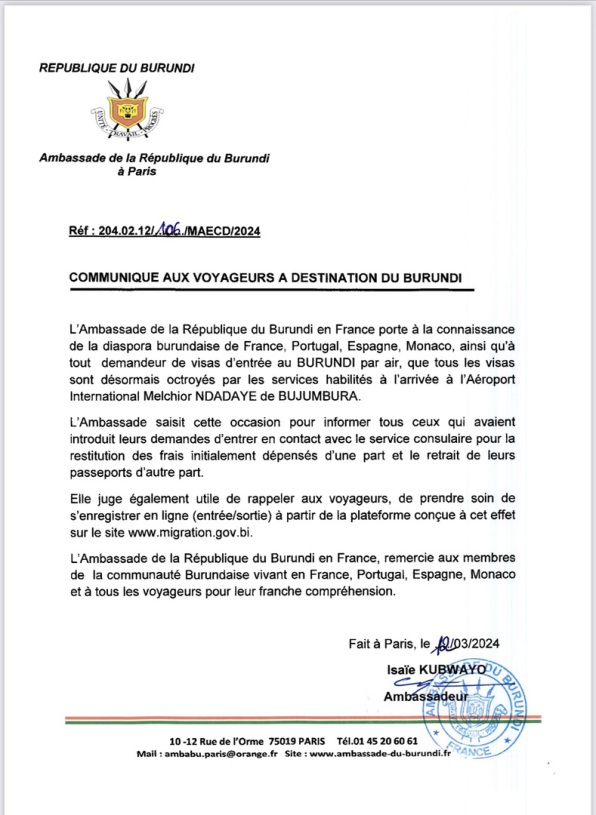 Le Burundi a récemment lancé son tout nouveau visa électronique pour faciliter les démarches de voyage des touristes et des professionnels. Ce document permet d’introduire la demande de visa qui sera finalisée lors de l’arrivée au Burundi.