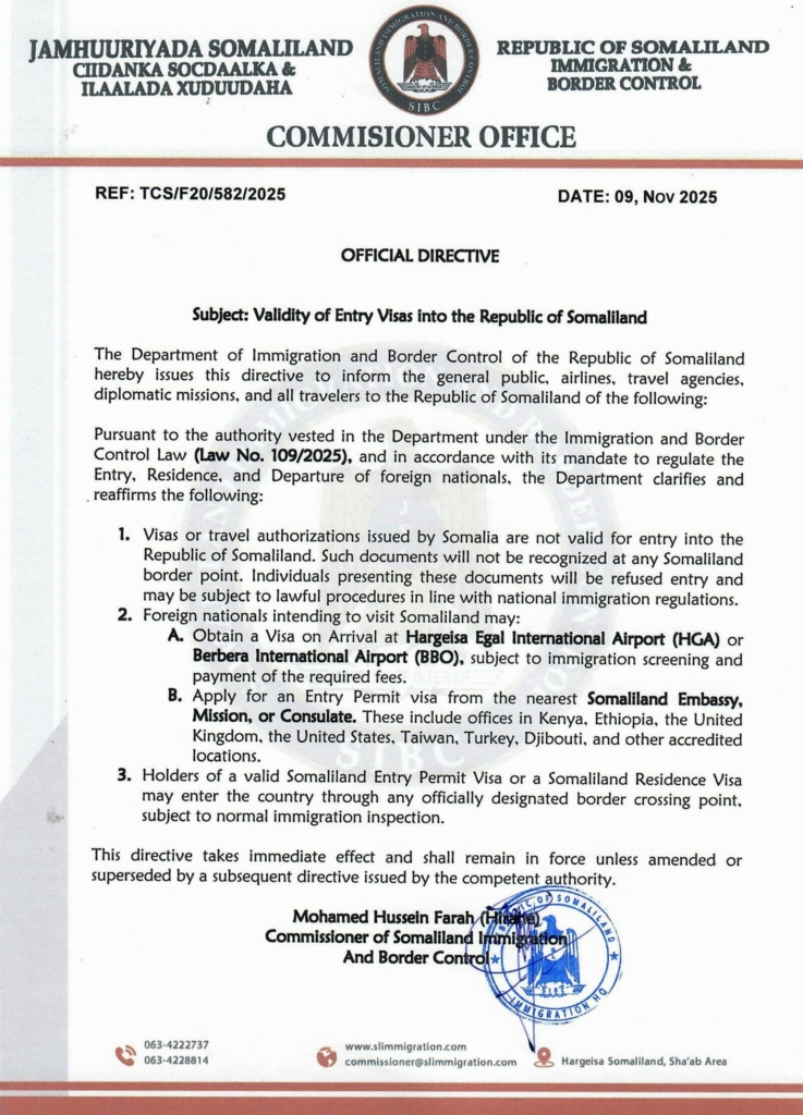 Le gouvernement du Somaliland, qui revendique son indépendance, a formellement annoncé le 9 novembre 2025 qu’il ne reconnaîtrait plus l’e-visa délivré par le gouvernement fédéral de Somalie.