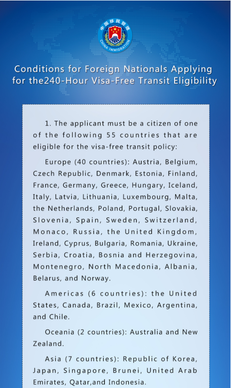 Désormais, plusieurs ressortissants peuvent entrer sur le territoire chinois sans visa pour une période allant jusqu’à 10 jours, à condition de transiter vers un pays tiers. Durant ce séjour, ils peuvent profiter du pays pour le tourisme ou effectuer des activités professionnelles, à condition de bien respecter les exigences suivantes :