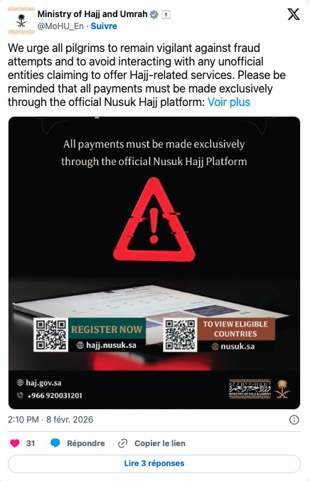 Tout se passe sur la plateforme gouvernementale Nusuk Hajj. C’est le seul canal officiel pour obtenir votre visa si vous êtes hors des pays à “missions Hajj” gouvernementales (comme l’Indonésie ou le Pakistan).
