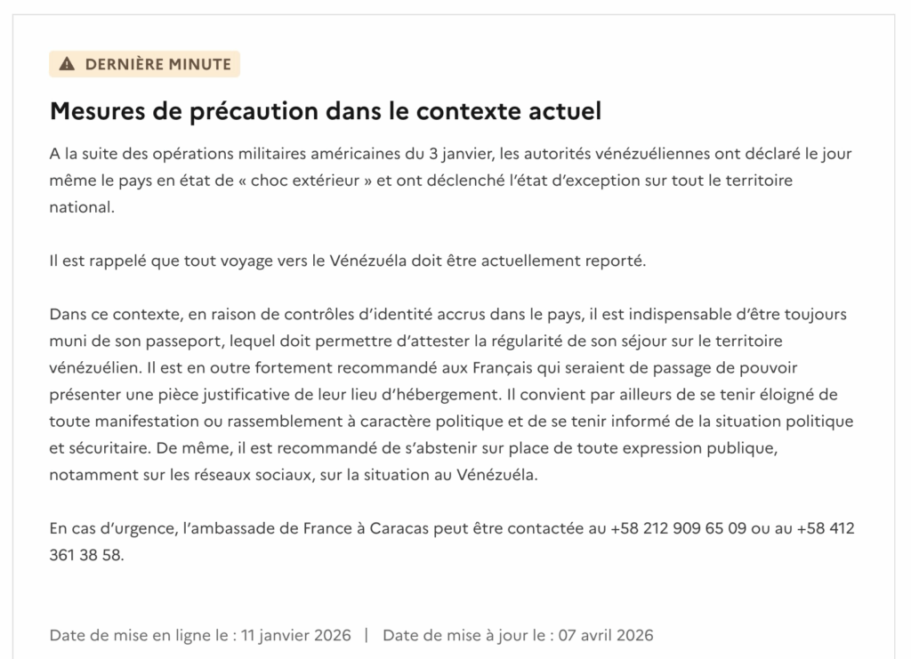 Aucun guide honnête sur le Venezuela ne peut faire l’économie de ce paragraphe. Au moment de l’écriture, la quasi-totalité des grandes chancelleries déconseillent les voyages non essentiels vers le pays. Le département d’État américain classe le Venezuela en niveau 4 (« Do Not Travel ») et alerte spécifiquement sur les risques de détention arbitraire de ressortissants américains. Le gouvernement canadien a suspendu sa capacité d’assistance consulaire sur place. Le Royaume-Uni et l’Australie tiennent des positions similaires.