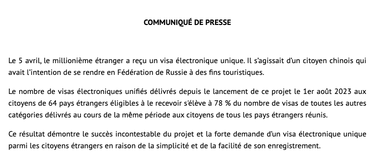 Le gouvernement russe prévoit d’assouplir encore davantage les conditions d’entrée. Selon Maria Zakharova, porte-parole du ministère russe des Affaires étrangères, la validité du visa électronique devrait prochainement passer de 60 à 120 jours, tandis que la durée de séjour autorisée serait étendue de 16 à 30 jours. Par ailleurs, une autorisation électronique pourrait remplacer les cartes de migration papier, renforçant la sécurité des entrées sur le territoire.