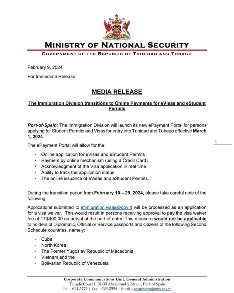 Initialement prévue pour le 1er mars 2024, l’implémentation du système de demande de visa électronique par la division de l’immigration de Trinité-et-Tobago 🇹🇹 a été repoussée jusqu’à nouvel ordre. Ce changement impacte les voyageurs soumis à une obligation de visa pour entrer dans le pays.