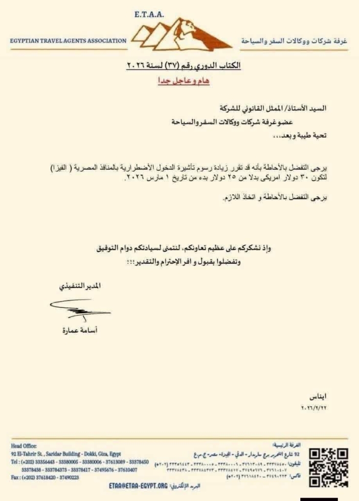 Heute, am 23. Februar 2026, hat die Spannung ein Ende: Die offizielle Entscheidung fiel gestern. Eine Kopie des Rundschreibens der Kammer der ägyptischen Reisebüros (ETAA) landete heute Morgen auf unserem Schreibtisch. Die Visagebühren werden zwar erhöht, aber die Presse hatte sich in Bezug auf den Betrag stark geirrt. Hier ist alles, was Sie wissen müssen, um Ihre Abreise ohne böse Überraschungen vorzubereiten.