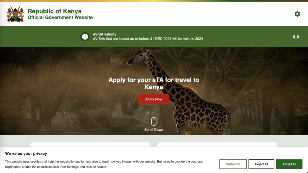 Der ETA-Antrag für Kenia kann eingereicht werden über das Regierungsportal oder über eine zukünftige mobile Anwendung namens "Kenia Travel Authorization". Die folgenden Schritte sind zu befolgen: