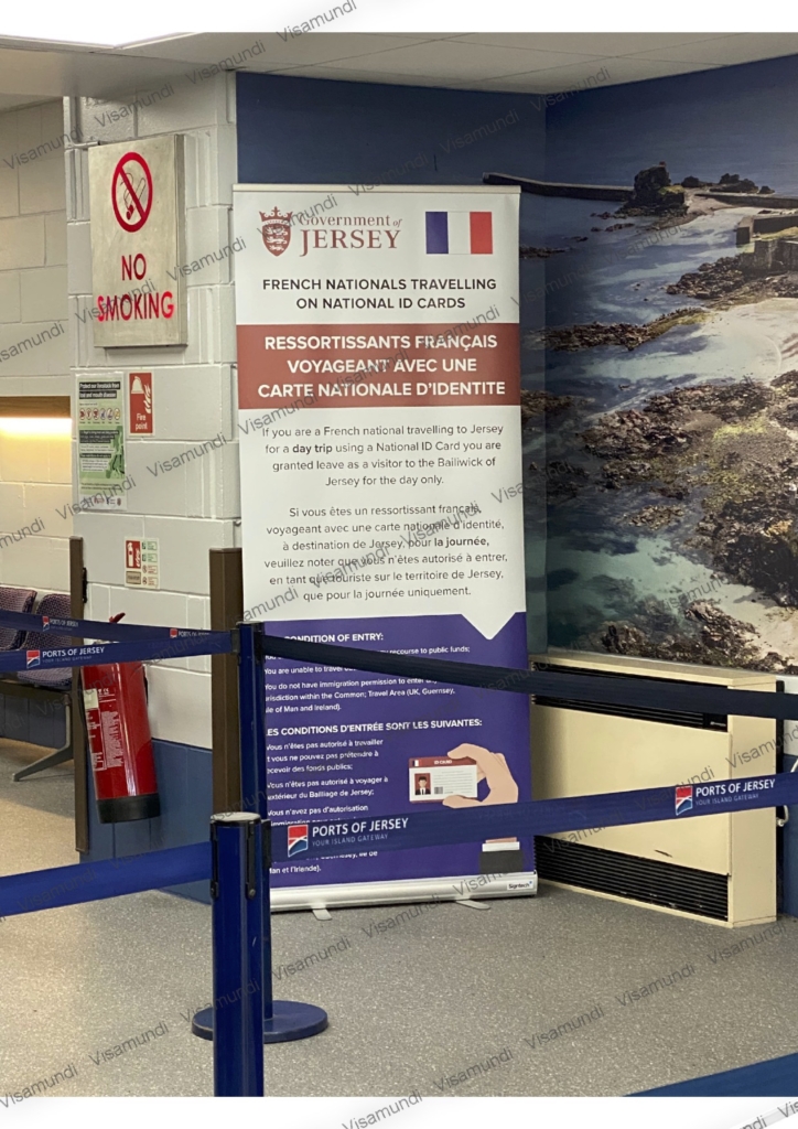 Ein Schild vor der Einwanderungskontrolle scheint immer noch zu erlauben, dass Franzosen mit einer gültigen CNI (carte nationale d'identité) nur von Frankreich aus für einen Tag auf die Kanalinsel Jersey einreisen können.