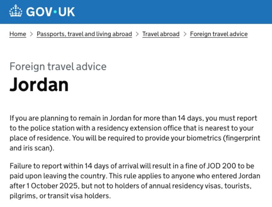 Seit dem 1. Oktober dieses Jahres hat eine neue jordanische Regelung zur Registrierung von Ausländern nach 14 Tagen Aufenthalt bei Reisenden Besorgnis ausgelöst, da sie ähnliche Auflagen wie in anderen Ländern für die Überwachung ausländischer Einwohner vorsieht. Es ist zu betonen, dass diese Verpflichtung nicht für die große Mehrheit der Touristen gilt.