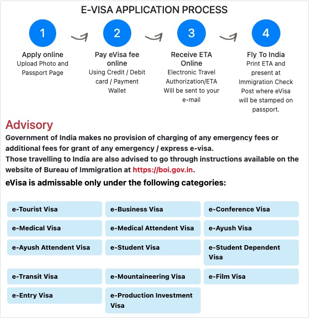 Staatsangehörige aus förderfähigen Ländern können den gesamten Antrag ausfüllen. Online-Visumverfahren, müssen jedoch gegebenenfalls die Genehmigung des zuständigen Ministeriums einholen. Vor der Reise nach Indien müssen sie die genehmigte elektronische Reisegenehmigung (ETA) um nach Indien einzureisen. Nach ihrer Ankunft in Indien müssen sich ausländische Staatsangehörige bei der Einwanderungsbehörde zur Erfassung ihrer biometrischen Daten melden, woraufhin das Visum in ihren Reisepass eingetragen wird.