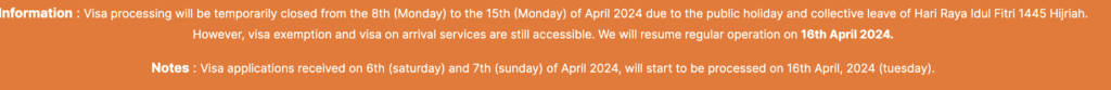 Während des Hari Raya Idul Fitri kommt es häufig vor, dass Botschaften und Konsulate muslimischer Länder im eingeschränkten Dienstbetrieb arbeiten, was bedeutet, dass ihre Kapazitäten zur Bearbeitung neuer Visumanträge sowie zur Bereitstellung von Informationen und Beantwortung von Fragen der Antragsteller stark eingeschränkt sind.