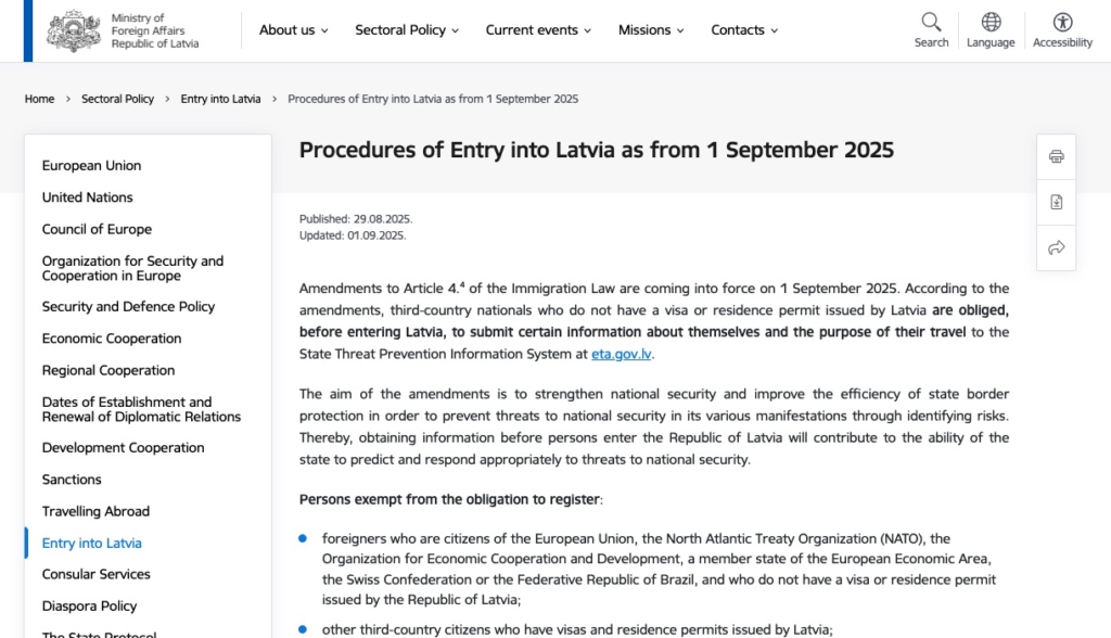 Lettland verschärft seine Einreiseverfahren mit der Einführung einer neuen Anforderung für bestimmte internationale Reisende. Seit heute 1. September 2025Die Republik Lettland führt eine Reihe von Maßnahmen durch. Elektronische Reisegenehmigung (ETA) obligatorisch.