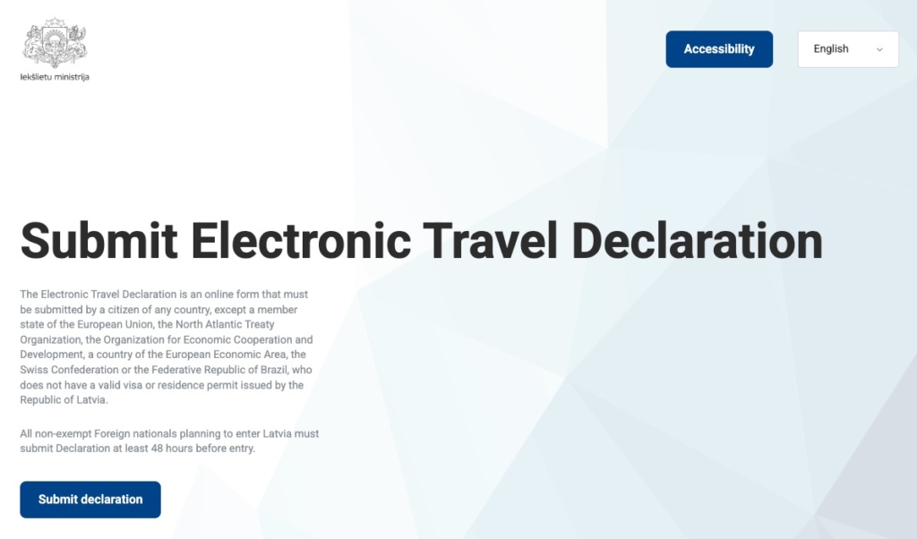 Die Erklärung muss eingereicht werden online auf der offiziellen Website eta.gov.lv. Sie muss ausgefüllt werden mindestens 48 Stunden vor der geplanten Einreise in der Republik Lettland. Jeder ausländische Staatsangehörige muss die folgenden Angaben machen persönlichEs gibt jedoch Ausnahmen, z.B. für Minderjährige oder rechtlich unfähige Personen, deren Erklärung von einem gesetzlichen Vertreter eingereicht werden kann.