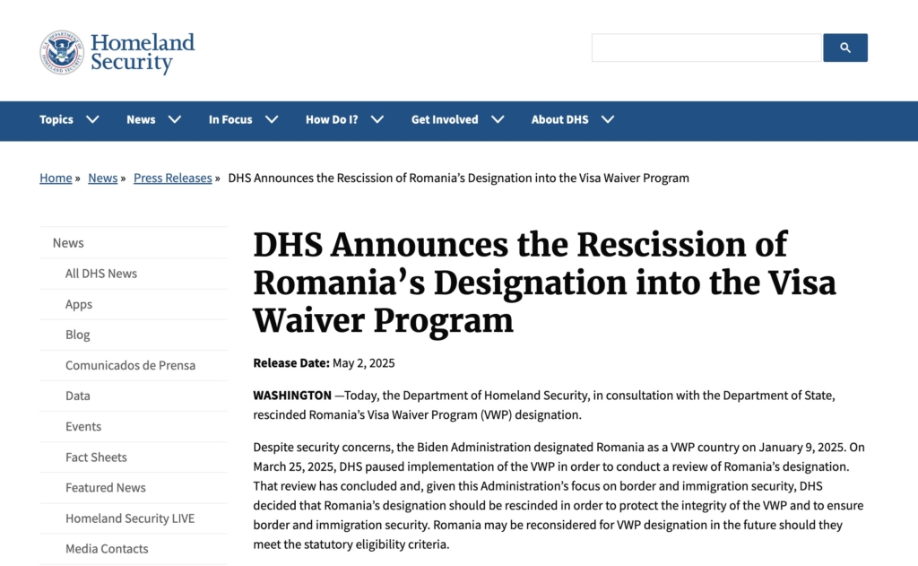 Schließlich, Die Trump-Regierung widerrief die Aufnahme Rumäniens in das VWP, eine Entscheidung, die am 2. Mai 2025 vom DHS bekannt gegeben wurde. der die ursprüngliche Entscheidung der Biden-Regierung kritisierte.