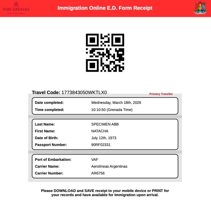 Vous pouvez soit imprimer le reçu, soit le sauvegarder sur votre téléphone. Les deux formats sont acceptés par les agents d’immigration à l’aéroport Maurice Bishop International ou aux autres points d’entrée. Nous recommandons de conserver les deux formats par sécurité.