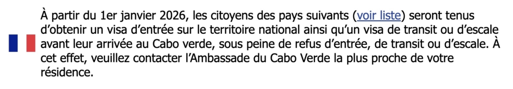 The Cape Verdean authorities have announced a new measure on their online visa platform that will come into effect on January 1, 2026. Several nationalities will be required to obtain a visa before arriving in Cape Verde. These include: single-entry visa as well as transit or stopover visa.