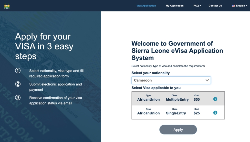 Travelers can pay the e-visa fee online with a Visa, Mastercard or American Express credit card. However, the Sierra Leone authorities recommend planning ahead and applying for the visa well in advance of arrival, as this can take several weeks or even longer in some cases.