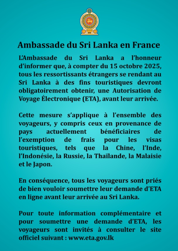 This new update, effective after a Supreme Court ruling, cancels the eVisa platform introduced earlier this year and marks a return to the previously applicable system. An official press release was published by several Sri Lankan Embassies, including Embassy in France.