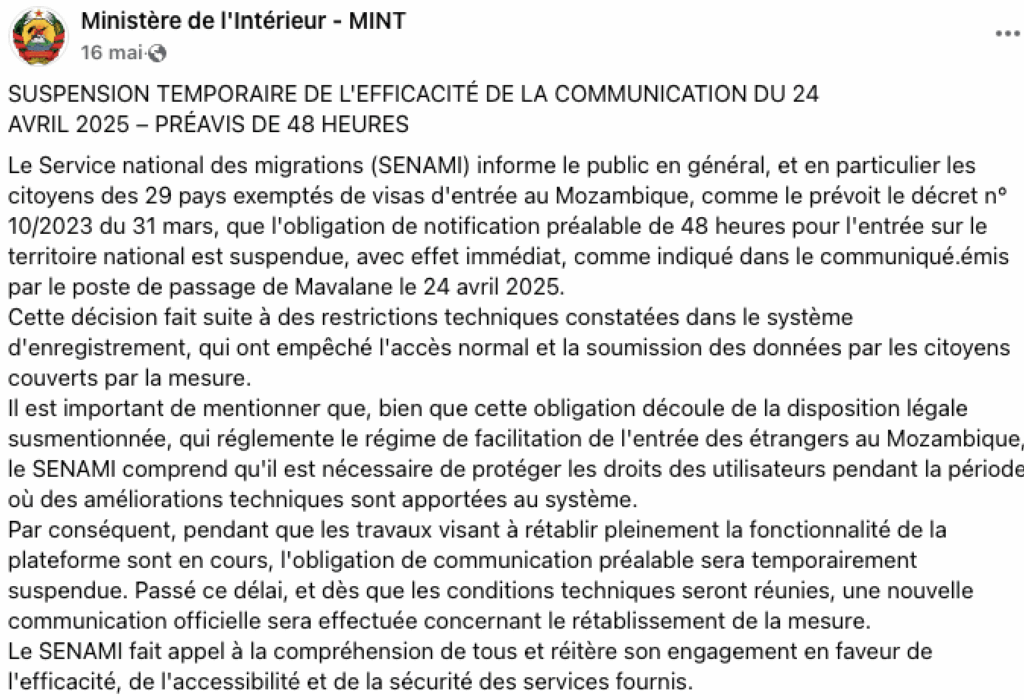 El 16 de mayo de 2025, Mozambique anunció, suspensión inmediata y temporal de la obligación para que los viajeros de 29 países exentos de visado facturen al menos 48 horas antes de llegar a Francia. Esta medida, introducida a finales de abril de 2025, fue concebida para reforzar la seguridad en las fronteras y anticipar mejor los flujos de pasajeros.