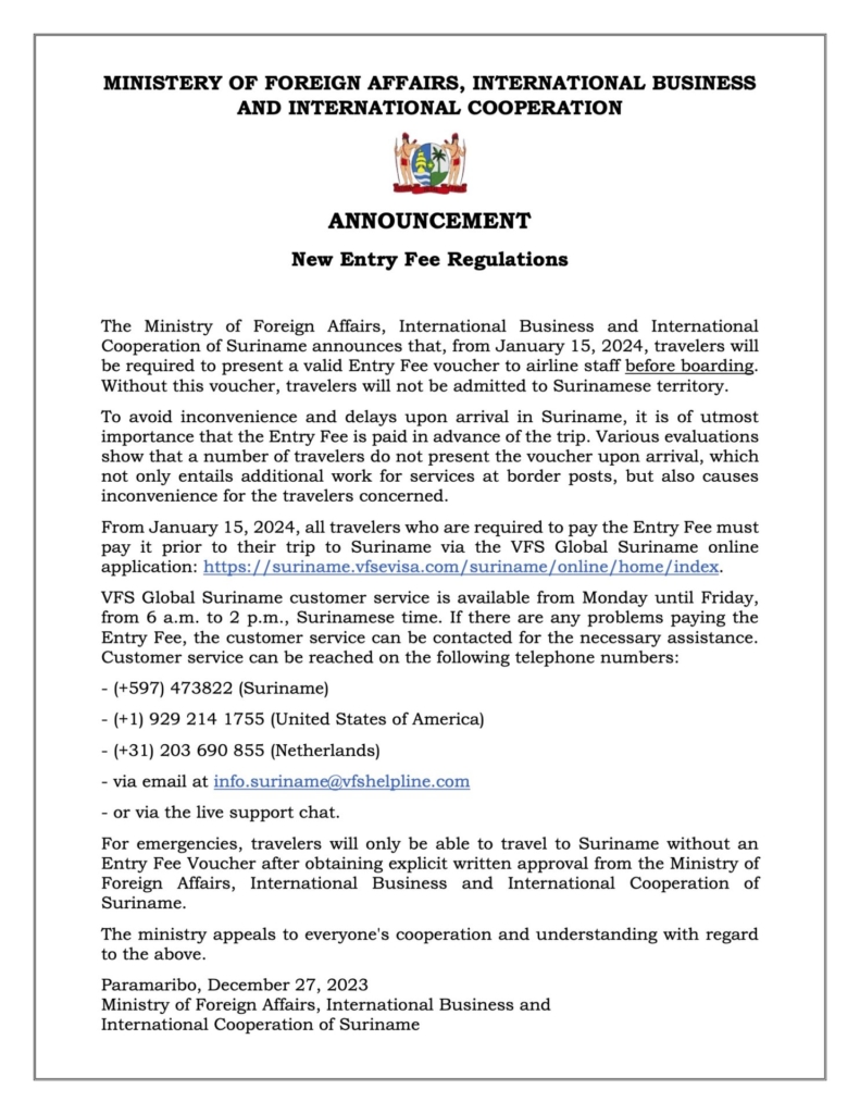 A partir de ahora, los viajeros que deseen ir al Suriname🇸🇷 debe tener en cuenta la nueva normativa relativa a las tasas de entrada. Desde el 15 de enero de 2024, es obligatorio pagar estas tasas antes de embarcar en un vuelo con destino a este país sudamericano.