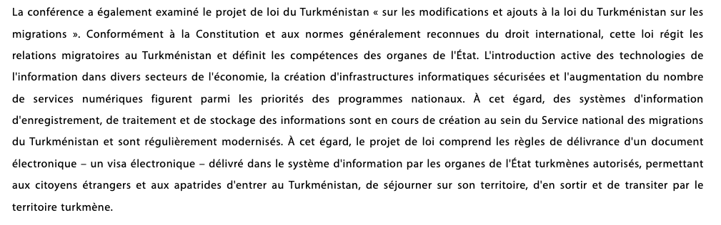 El 12 de abril, el octava sesión de la séptima legislatura del Parlamento de Turkmenistán. Los parlamentarios debatieron un nuevo proyecto de ley de migración, que incluye la crear un visado electrónico. Si este texto se aprueba en los próximos meses, permitirá simplificar y modernizar los procedimientos de entrada en Turkmenistán. Las autoridades subrayan que la integración de las tecnologías de la información y el establecimiento de infraestructuras digitales seguras son ahora prioridades nacionales. El Servicio Nacional de Migración ya está desarrollando sistemas de registro y gestión de datos, que se actualizan periódicamente para satisfacer estas nuevas necesidades.