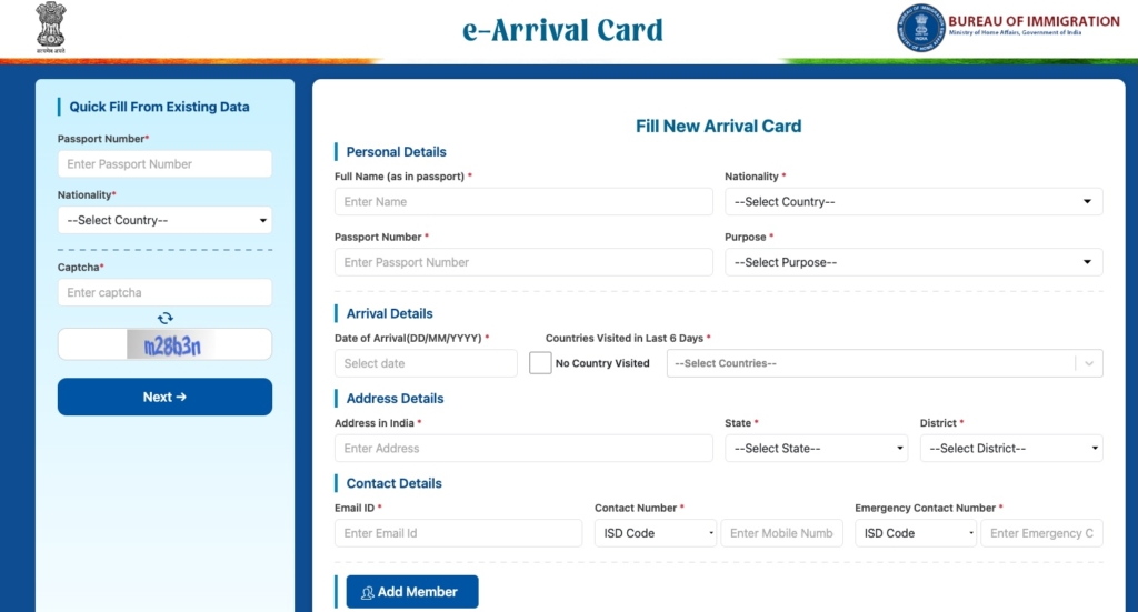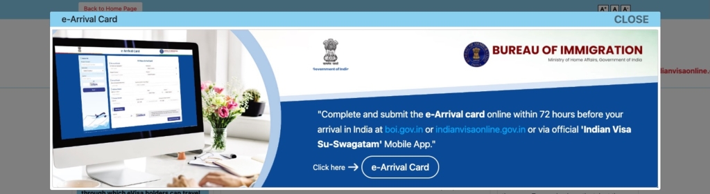 El formulario de la tarjeta de llegada electrónica está disponible en los sitios web oficiales de la Oficina de Inmigración y del Ministerio del Interior del Gobierno de la India indianvisaonline.gov.in/, boi.gov.in/ o desde la aplicación móvil Su-Swagatam (Android O iOS)
