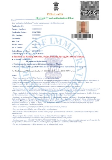 Por abuso del lenguaje, también se denomina "visado a la llegada", aunque el visado electrónico debe solicitarse antes de embarcar hacia la India y no se expide en el acto. Todo se hace íntegramente en línea, por lo que no tiene que enviar nada por correo ni desplazarse. Una vez cumplimentada y pagada la solicitud, deberá enviar fotocopias del pasaporte y una foto tamaño carné. Recibirá una autorización de viaje en PDF que deberá imprimir y presentar en el aeropuerto de llegada para obtener el visado definitivo en su pasaporte y que le tomen las huellas dactilares.