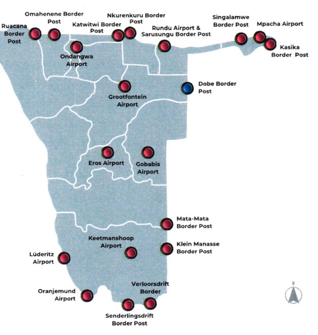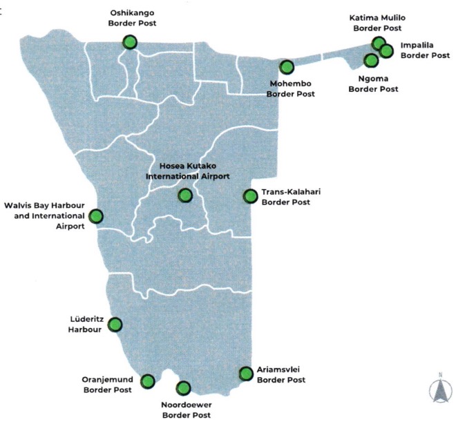 Su visado electrónico se acepta en la mayoría de los aeropuertos internacionales, incluidos Windhoek Hosea Kutako, Walvis Bay, Eros y Ondangwaasí como en varios pasos fronterizos terrestres y puertos marítimos.