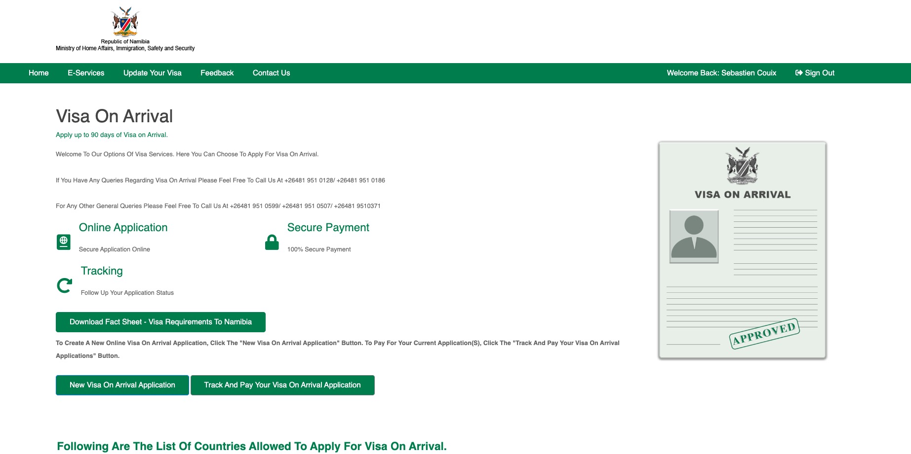 Su visado electrónico se acepta en la mayoría de los aeropuertos internacionales, incluidos Windhoek Hosea Kutako, Walvis Bay, Eros y Ondangwaasí como en varios pasos fronterizos terrestres y puertos marítimos.