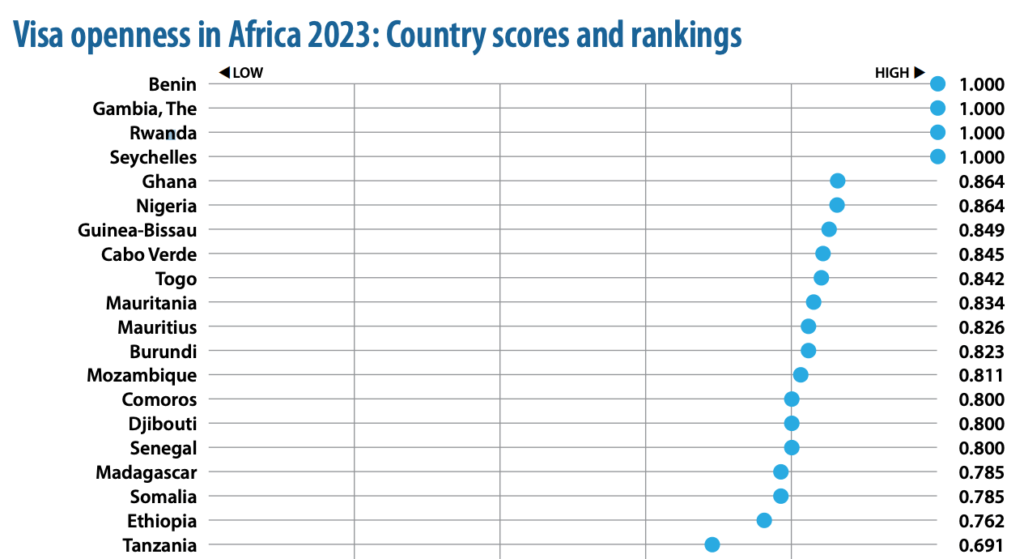 Nel 2023, il Ruanda si è affermato come nuovo campione della politica dei visti dopo aver gradualmente liberalizzato il suo regime negli ultimi otto anni. Nel 2016, Questo paese senza sbocco sul mare ha autorizzato l'ingresso senza visto per i cittadini di quasi 90% altri paesi africani. Oggi le persone provenienti dal resto del continente possono entrare senza formalità preliminari.