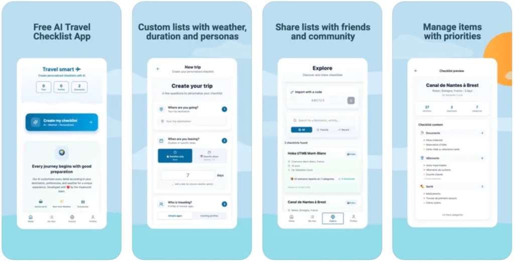 Con Visamundi Lista di controllo per i viaggi AIQuesti problemi appartengono al passato. L'applicazione offre liste di controllo intelligenti e personalizzate in base alla destinazione, alla durata del viaggio e alle preferenze personali (restrizioni alimentari, disabilità, ecc.).. Basta inserire i dettagli del suo viaggio e l'AI genera un elenco completo di elementi da preparare: documenti amministrativi, equipaggiamento, abbigliamento adatto al clima, vaccinazioni consigliate e persino consigli pratici su come evitare le trappole turistiche.